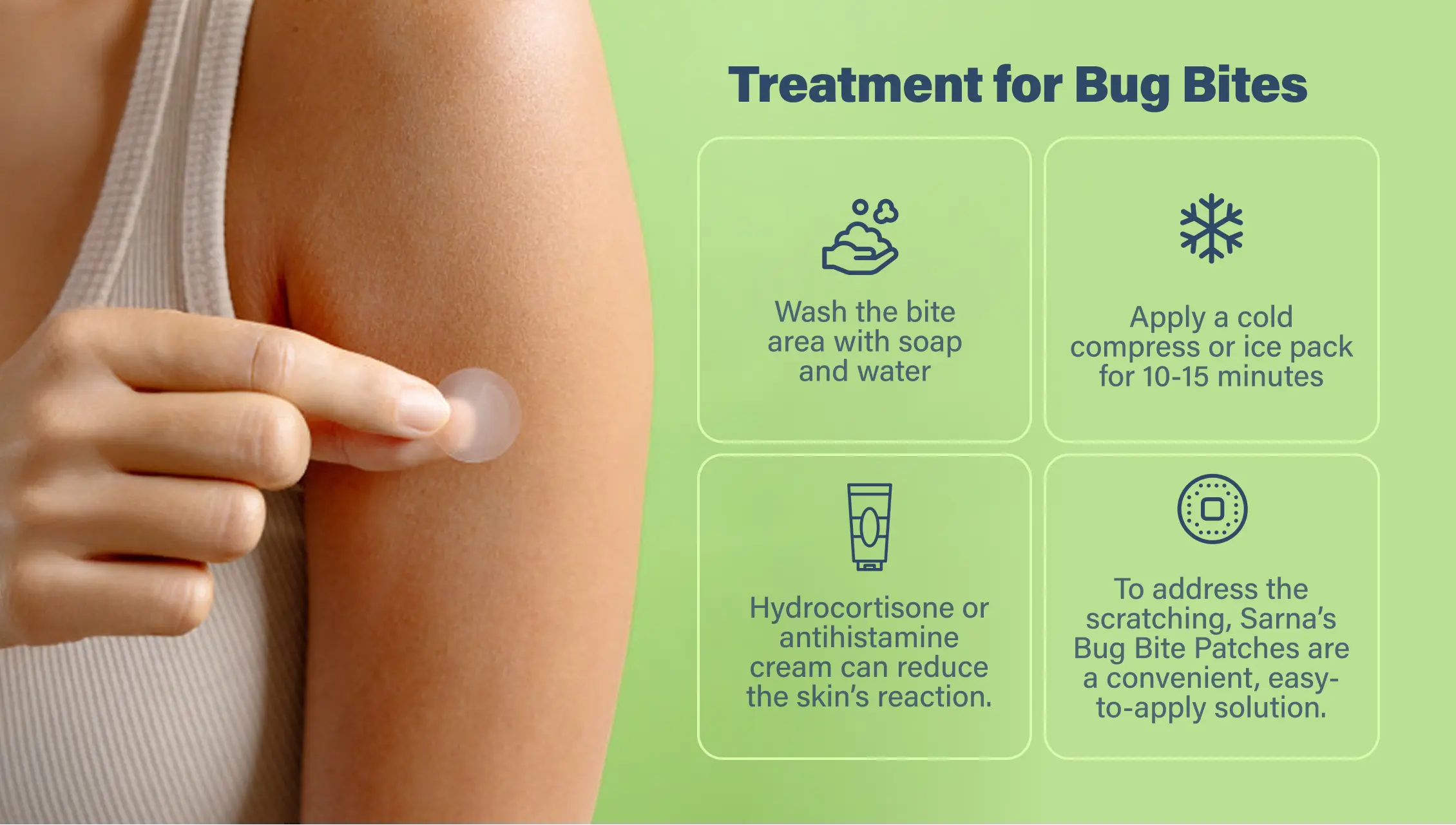 To address the scratching, Sarna’s Bug Bite Patches are a convenient, easy-to-apply solution. Sarna’s peel-and-stick patches deliver skin-soothing aloe, witch hazel, and chamomile without mess or fuss. By placing a barrier between your fingernails and your bug bite, the patches can help protect your skin and prevent picking and scratching. And they’re steroid-free, latex-free, and kid-safe, so you can bring them on a trip or outing and feel safe protecting the whole family.